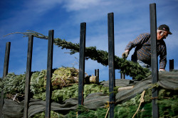 Arlan Schroeder, an associate of Wolcyn Tree Farms in Cambridge, Minnesota, unloads a batch of fraser firs and canaan fir trees to John Roy, of Pikes Peak Exterior Decoration, who runs several local Christmas tree outlets, Monday November 19, 2007 in Colorado Springs, Colorado. Roy, who received a little over 100 trees just in time for a big holiday weekend, said, “Farm direct trees. It doesn’t get any better!” PHOTO BY: TODD SPOTH